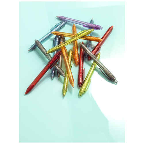 Bolígrafo con mecanismo de clic y cuerpo transparente. El cuerpo está fabricado con botellas de agua recicladas, lo que contribuye a reducir la cantidad de residuos plásticos.