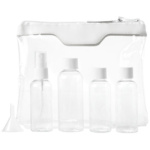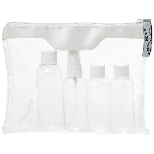 Este neceser apto para el avión permite llevarlo a bordo contigo. Incluye 2 botes de 50 ml, 1 bote de 90 ml, 1 pulverizador y 1 embudo. Los botes, el pulverizador y el embudo se entregan en una bolsa de plástico, separados del neceser. No permite la grabación de los componentes.