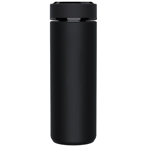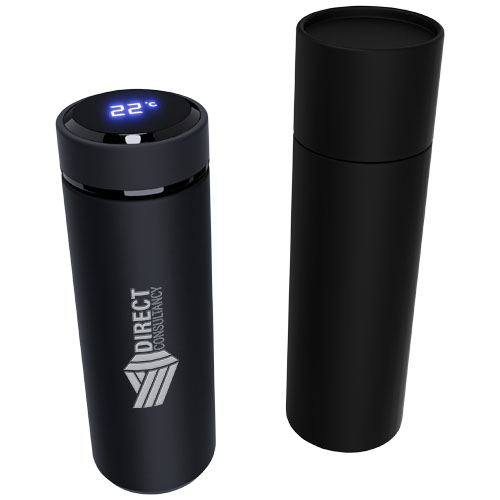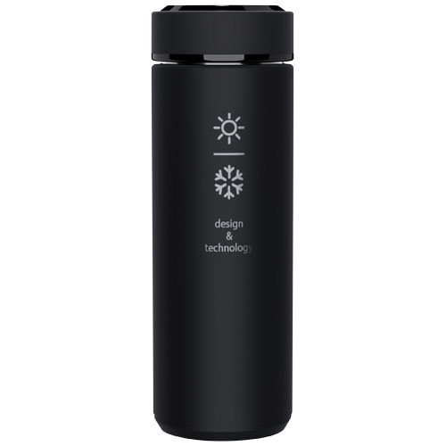 Botella de 450 ml de acero inoxidable con doble pared aislante y sensor de temperatura. Gracias al sistema «Touch & Light», la temperatura de la bebida se muestra en la tapa de la botella (en ° Celsius). Adecuado tanto para bebidas calientes como frías. Viene en una caja cilíndrica de regalo fabricada con papel reciclado. Tamaño: Ø 47 × 225 mm. Batería incluida: CR 2450 (3 V). La batería no puede sustituirse. Puede mostrar la temperatura 20 000 veces.